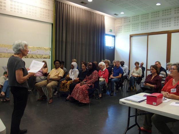 AG du 23 juin…chacun y avait sa place..Huguette,puis Huguette pour remplacer Jean François, Sylvie,Laurence, Gérard et Françoise..tout a été dit,clôturé,approuvé,budgété et voté..Quelques apprenants,formateurs ,membres de la mairie et directeur de Mandela étaient présents. Beaucoup de moments forts…le spectacle bien-sûr où on ne peut pas retenir ses larmes d’émotion en voyant cet homme et ces femmes parfois costumées, parler librement des us et coutumes de leurs lointains pays, de Kristina en hôtesse de l’air…des rires, des sourires…du goûter algérien..de Sylviane dans l’ombre mais bien présente autour de ses « acteurs »..mais surtout, l’annonce du départ de Gérard après 11 ans de bons et loyaux services dans l’association, entouré de Huguette et de ses deux successeurs Françoise et Daniel..