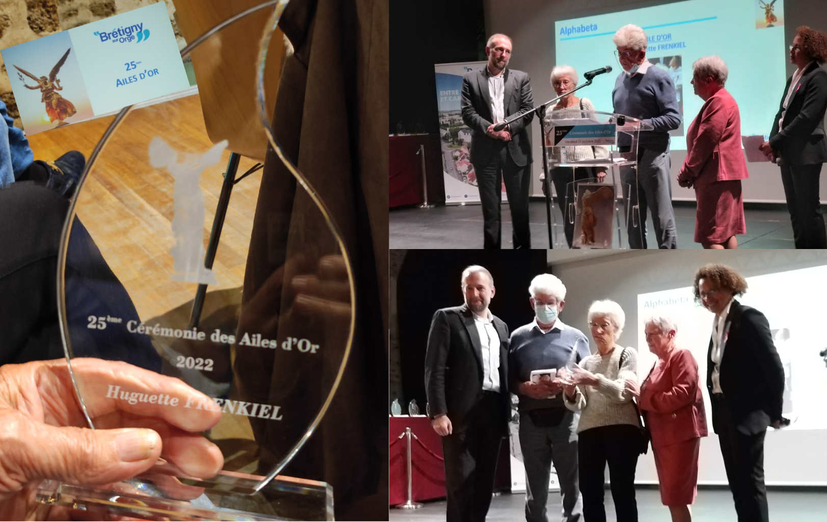 C’est le 21 octobre dernier, à l’occasion de la 25ème édition des » Ailes d’or » que notre ex- présidente, Huguette FRENKIEL a été récompensée par le maire de Brétigny pour son investissement au sein d’Alphabeta. Beaucoup de récompenses pour les sportifs, mais peu pour des associations telles que la nôtre. La mairie semble bien nous reconnaitre, nous apprécier et nous aimer. Armelle et Jean-Paul étaient là pour accompagner Huguette. Tout était parfait. Vous trouverez plus de détails sur le site de la ville de Brétigny